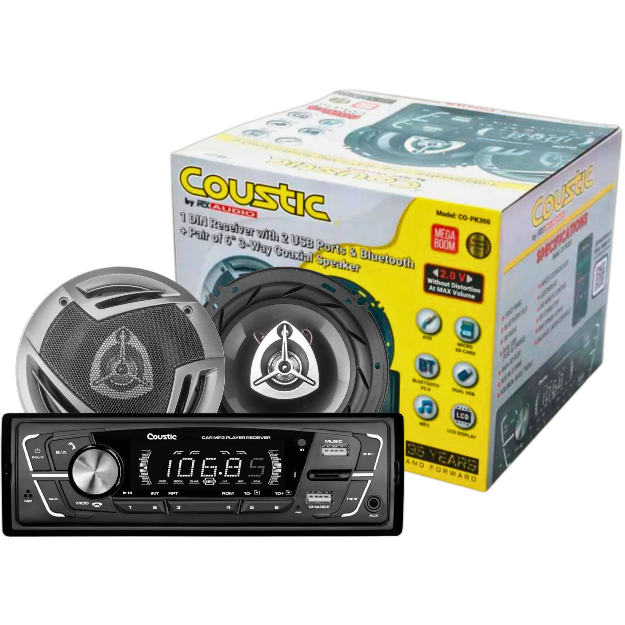El paquete de estéreo 1 DIN Coustic CO-PK300 con bocinas de 6 pulgadas es ideal para mejorar el sistema de sonido de tu automóvil. Con conectividad Bluetooth, dos puertos USB, y lector de tarjetas SD, disfrutarás de tu música favorita en todo momento. Las bocinas ofrecen un sonido claro y potente gracias a su diseño coaxial de 3 vías.