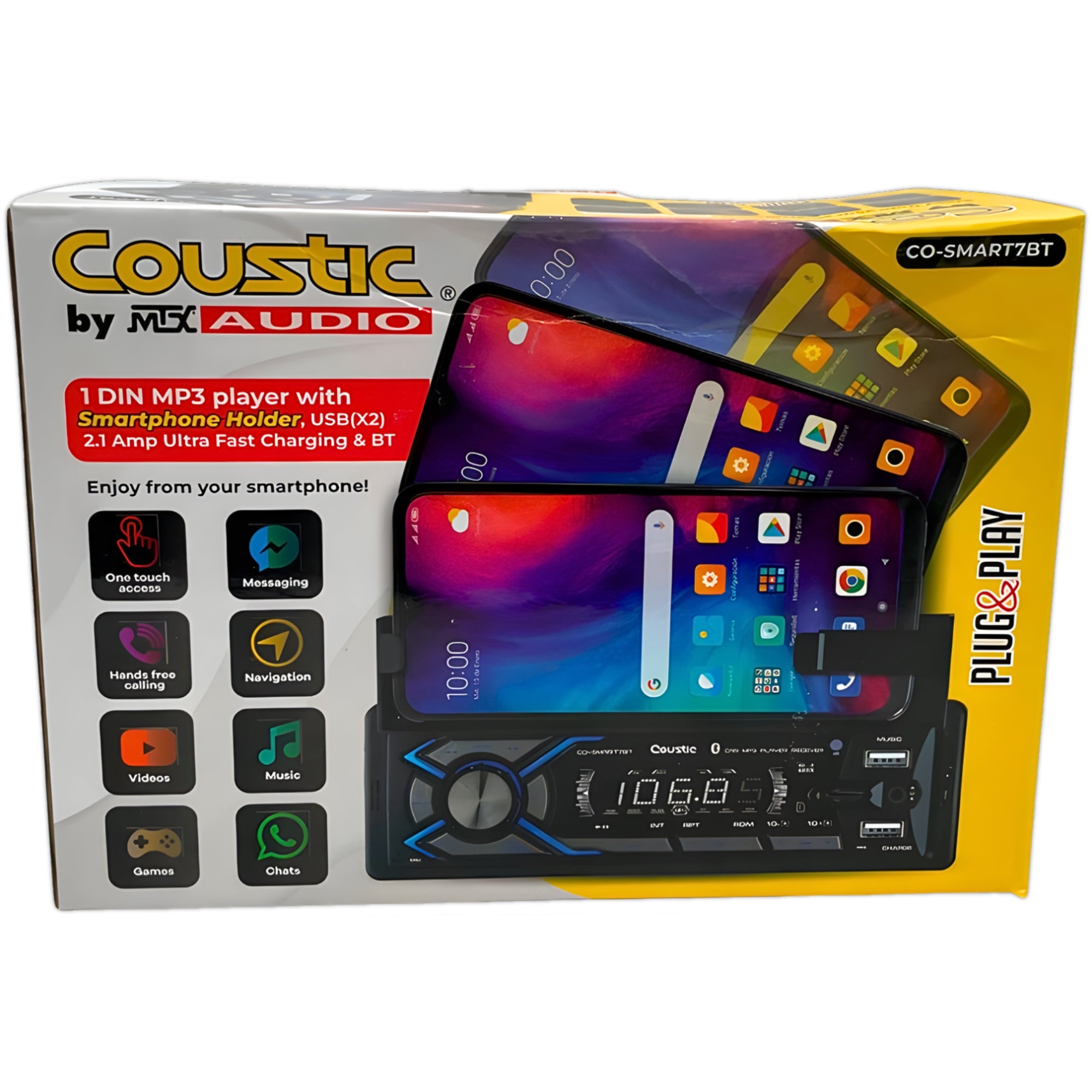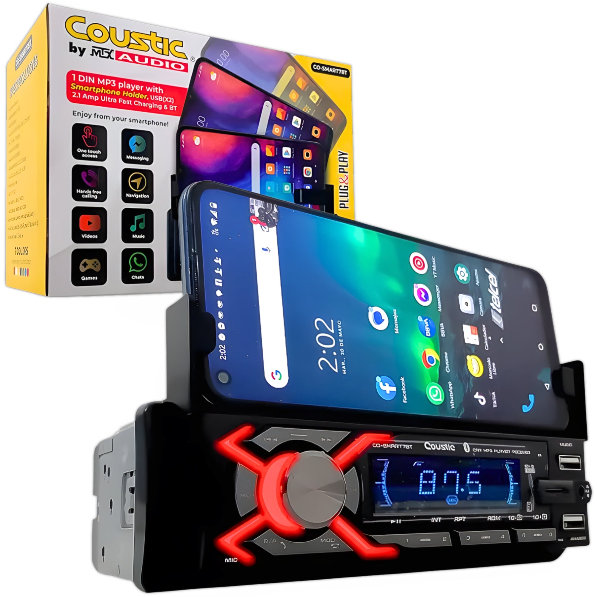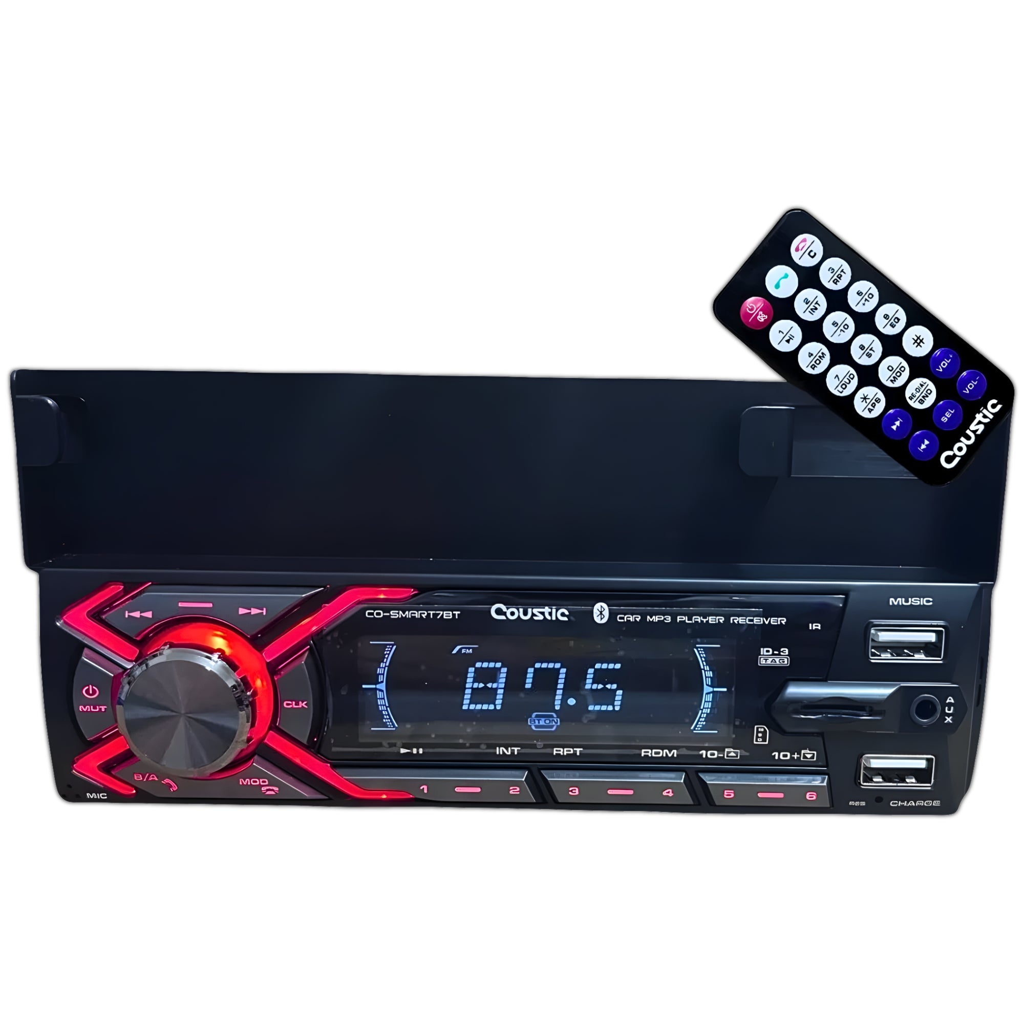 El estéreo CO-SMART7BT de la marca Coustic es un autoestéreo 1 DIN multimedia con conectividad moderna y funciones completas para sistemas de audio automotriz. Posee conectividad Bluetooth 5.0, doble puerto USB, soporte para teléfono, control remoto, salidas RCA y un diseño de instalación estándar, ideal para actualizar la unidad principal del vehículo con opciones de reproducción actuales.